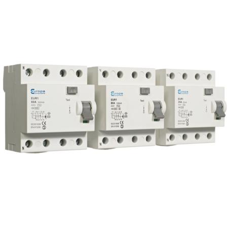 Europa EUR1 RCCB, 63A, 4 Pole, 100mA, Type A, 230V ac