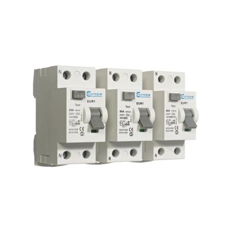 Europa EUR1 RCCB, 63A, 2 Pole, 30mA, Type A, 230V ac